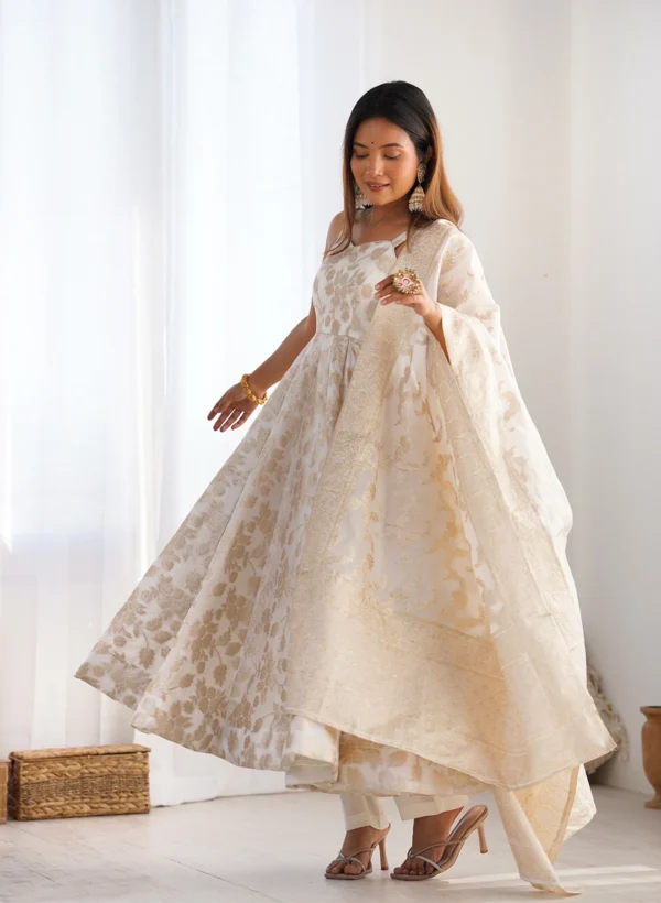 Cream Color Floral Print Organza Three Piece Anarkali Suit – Fashion Fram
