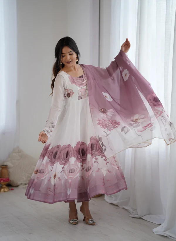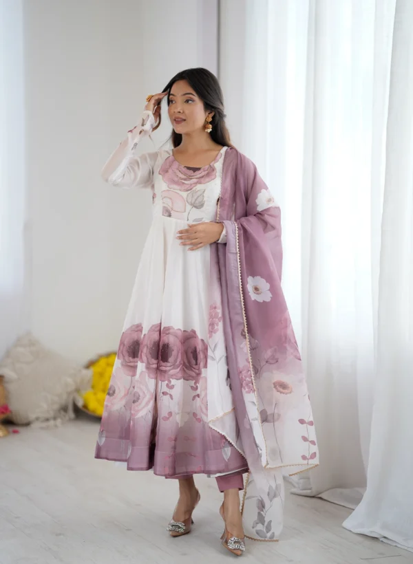 Cream Color Floral Print Organza Three Piece Anarkali Suit – Fashion Fram